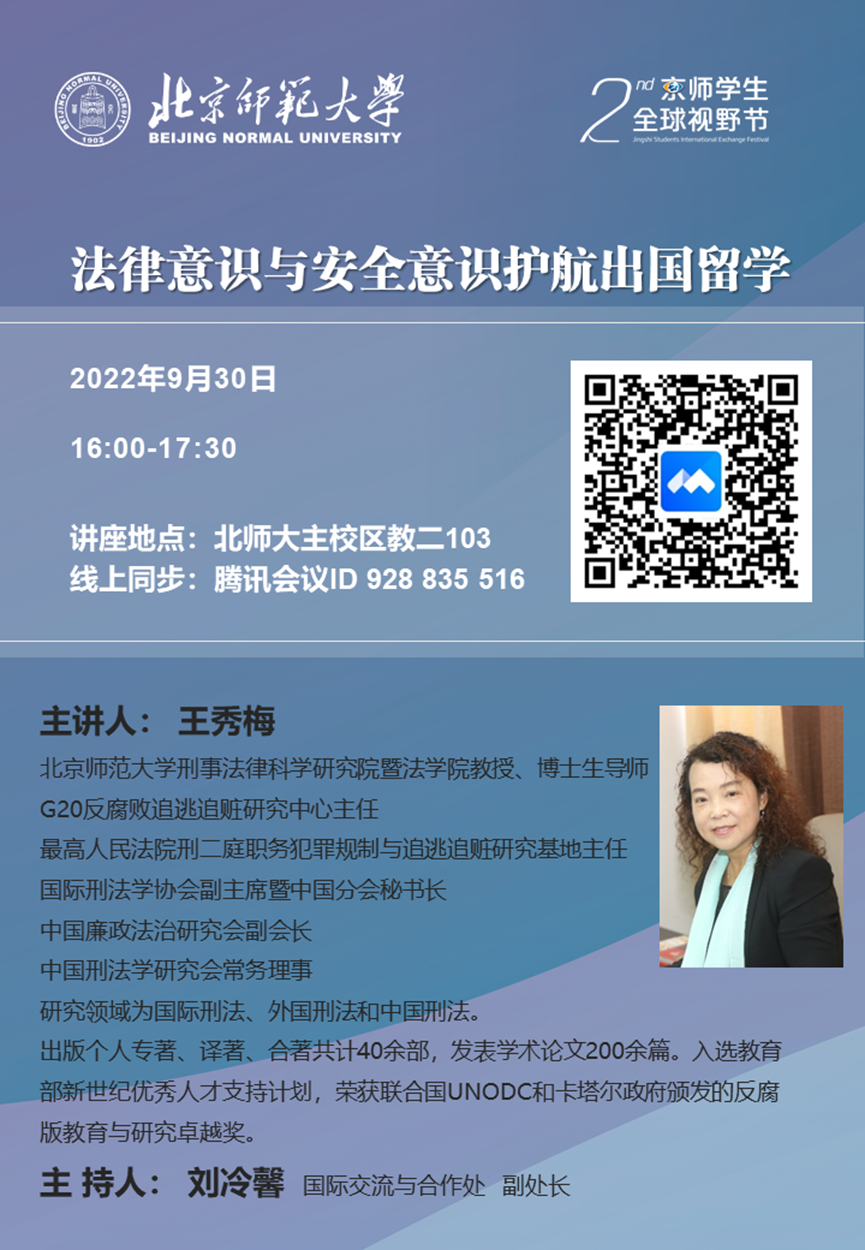 随着国际形势日益复杂,为做好新时代人才工作提供精神引领和思想保证,增强学生法律意识和安全意识,为学生出国留学保驾护航,北京师范大学国际交流与合作处特邀请我校法学院王秀梅教授从法律专业角度出发,结合具体案例,向同学们介绍在境外学习过程中如何遵纪守法、依法维权以及需要注意的政治、网络等方面的安全问题。