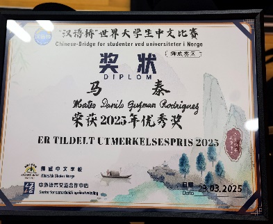 在此前举行的2025年世界汉语桥比赛中,挪威学校孔子课堂有两名选手参赛,分别获得三等奖和优秀奖。挪威学校孔子课堂荣获优秀组织奖。